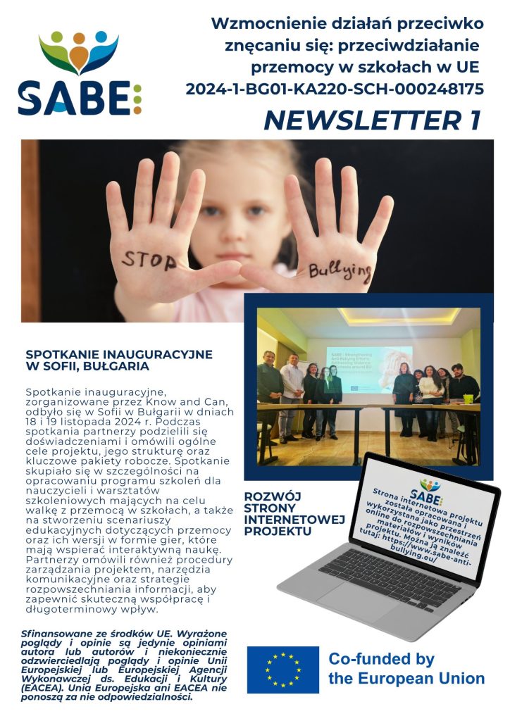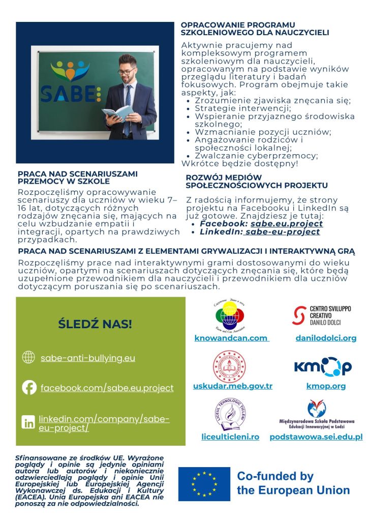 W ramach współpracy powstają narzędzia wspierające nauczycieli oraz specjalistów w reagowaniu na zjawiska przemocy i wykluczenia. W pierwszym newsletterze projektowym zostały zaprezentowane dotychczasowe działania, etapy współpracy oraz cele, które konsekwentnie realizujemy. Projekt SABE to ważny krok w stronę świadomej profilaktyki i wspólnej odpowiedzialności za dobro uczniów.